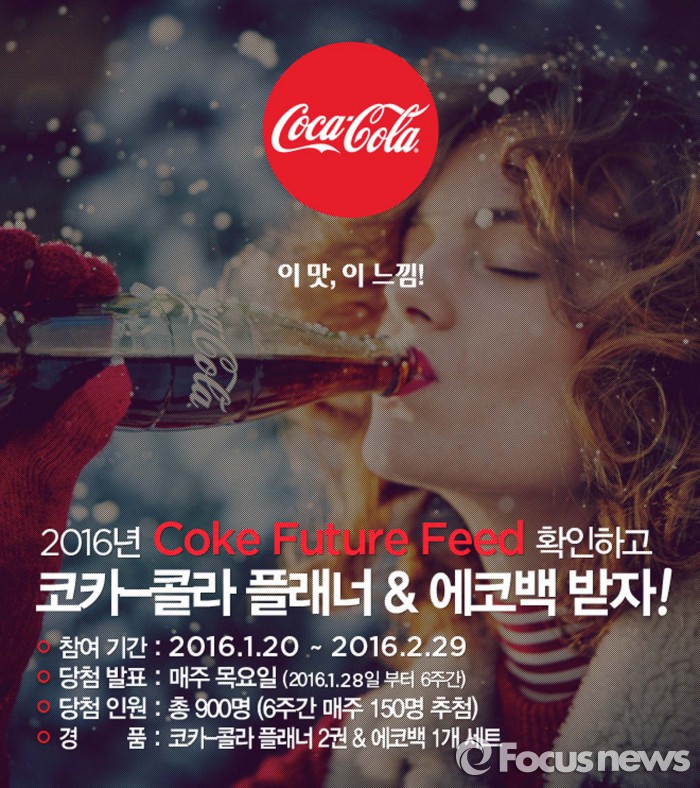 (서울=포커스뉴스) 코카콜라는 오는 2월29일까지 플래너와 에코백을 증정하는 페이스북 이벤트 ‘코-크 퓨쳐피드(Coke FutureFeed)’를 진행한다.