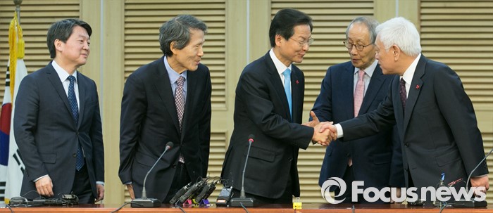 (서울=포커스뉴스) 25일 오전 서울 여의도 국회 의원회관에서 국민의당-국민회의 통합발표 기자회견을 마친 뒤 천정배 국민회의 창당준비위원장과 김한길 국민의당 상임부위원장이 악수하고 있다. 왼쪽부터 안철수 국민의당 인재영입위원장, 한상진 공동창당준비위원장, 천정배 국민회의 창당준비위원장, 윤여준 국민의당 공동창당준비위원장, 김한길 상임부위원장.