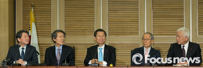 (서울=포커스뉴스) 25일 오전 서울 여의도 국회 의원회관에서 열린 국민의당-국민회의 통합발표 기자회견에 참석한 안철수(오른쪽부터) 국민의당 인재영입위원장, 한상진 공동창당준비위원장, 천정배 국민회의 창당준비위원장, 윤여준 국민의당 공동창당준비위원장, 김한길 상임부위원장이 취재진 질문에 답하고 있다.