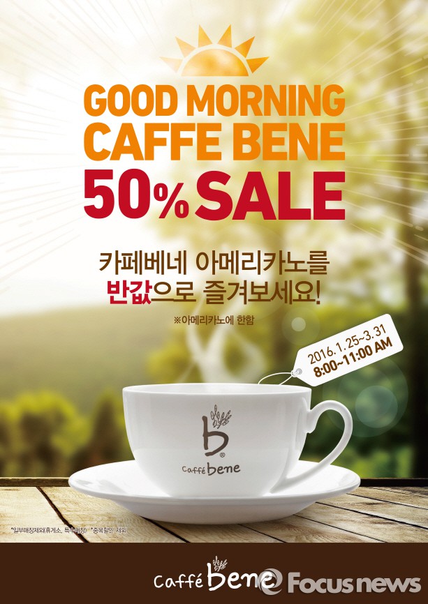 오전 8시부터 오전 11시까지 매장을 방문하는 모든 고객에게 3월31일까지 두 달간 아메리카노를 50% 할인된 가격으로 판매한다. (일부 매장 제외, 중복 할인 불가)