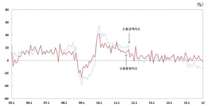 25일 한국은행이 낸 '2015년 12월 무역지수 및 교역조건' 자료에 따르면 작년 12월 수출금액지수는 전년 동기 대비 12.9% 감소했다. 이는 2009년 8월 같은 기간 -19.7%를 기록한 이후 6년 4개월 여만의 최고 하락폭이다.