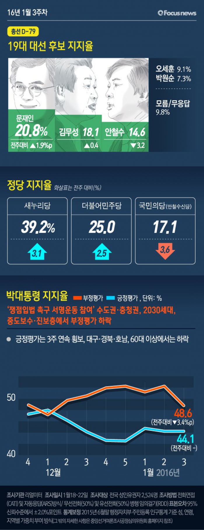이번 주간집계는 2016년 1월 18일부터 22일까지 5일간 전국 19세 이상 유권자 2,524명을 대상으로 전화면접(CATI) 및 자동응답(ARS) 방식으로 무선전화(50%)와 유선전화(50%) 병행 임의걸기(RDD) 방법으로 조사했고, 응답률은 6.4%이다.