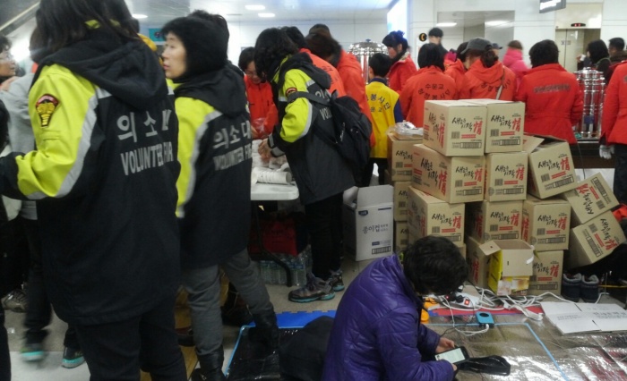(서울=포커스뉴스) 32년 만에 폭설로 제주국제공항이 폐쇄된지 3일째 되는 25일 오후 제주국제공항 대합실에 봉사단체 관계자들이 관광객들에게 간식을 나눠주고 있다.