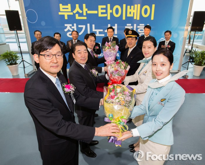 대한항공은 부산~타이베이 노선을 비롯해 △부산~오사카 △부산~방콕 △부산~홍콩 등 14개 부산발 국제선 노선을 취항하고 있다.이진호 대한항공 한국지역본부장(앞줄 왼쪽)과 홍기호 부산광역시 교통국장(둘째줄 왼쪽)이 부산~타이베이 신규노선 취항식에 참석해 대한항공 관계자들에게 꽃다발을 받고 있다. <사진제공=대한항공> 2016.1.25. 김현이 인턴기자