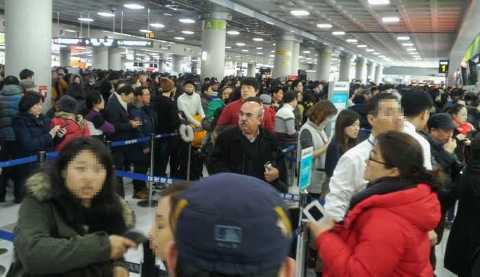 (서울=포커스뉴스) 32년 만에 폭설로 제주국제공항이 폐쇄된지 3일째 되는 25일 오후 제주국제공항 대합실에 모인 관광객들이 항공권을 발권하기 위해 줄을 서 있다. 국토교통부는 25일 오후 12시를 기해 운항을 재개한다고 밝혔다. 하지만 항공기에 쌓인 눈을 제거하는 등 작업들이 남아 있어 실제적인 운항재개는 오후 3시부터 이루어질 전망이다. <사진제공=김세희 사진가>