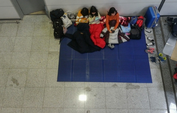 (서울=포커스뉴스) 32년 만에 폭설로 제주국제공항이 폐쇄된지 3일째 되는 25일 오후 제주국제공항 대합실에 모인 관광객들이 항공권을 발권하기 위해 줄을 서 있다. 국토교통부는 25일 오후 12시를 기해 운항을 재개한다고 밝혔다. 하지만 항공기에 쌓인 눈을 제거하는 등 작업들이 남아 있어 실제적인 운항재개는 오후 3시부터 이루어질 전망이다. <사진제공=김세희 사진가>