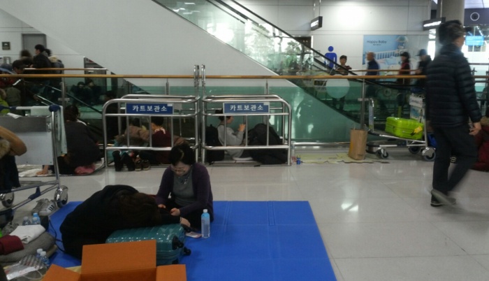 (서울=포커스뉴스) 32년 만에 폭설로 제주국제공항이 폐쇄된지 3일째 되는 25일 오전 제주국제공항 대합실에 모인 관광객들이 운항 재개를 기다리며 바닥에 누워 있다.
