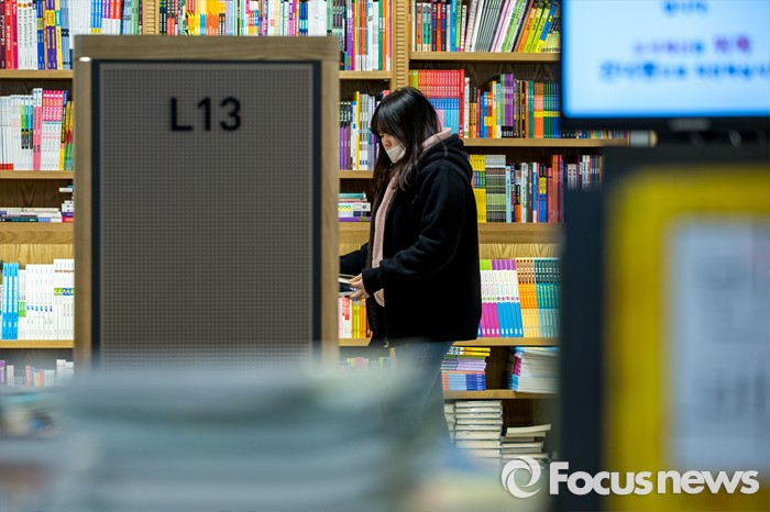 (서울=포커스뉴스) 서울 한 낮 기온이 영하권에 머물며 연일 강추위가 이어지고 있는 25일 오후 서울 종로구 교보문고 광화문점에서 개학을 앞둔 학생이 참고서를 보고 있다.