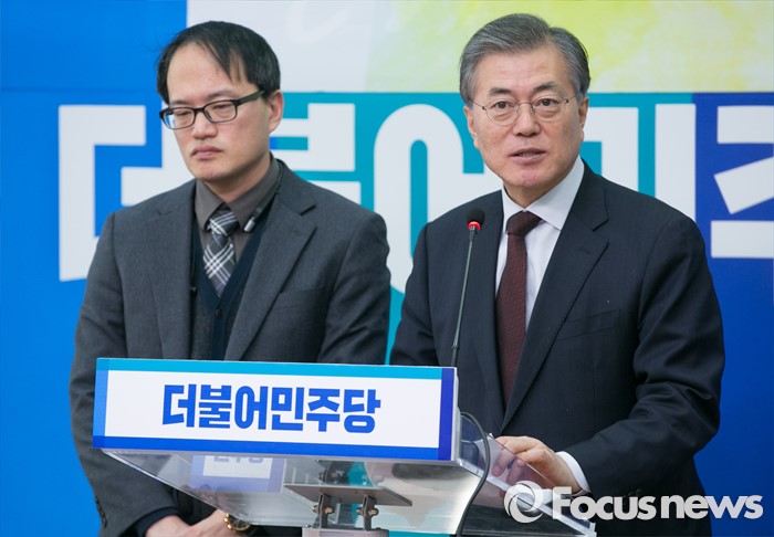 (서울=포커스뉴스) 문재인(오른쪽) 더불어민주당 대표가 25일 오후 서울 여의도 국회에서 열린 세월호 유가족 법률 대리인 등으로 활약한 박주민 전 민변 사무처장 인재영입 기자회견에 참석해 인사말을 하고 있다.