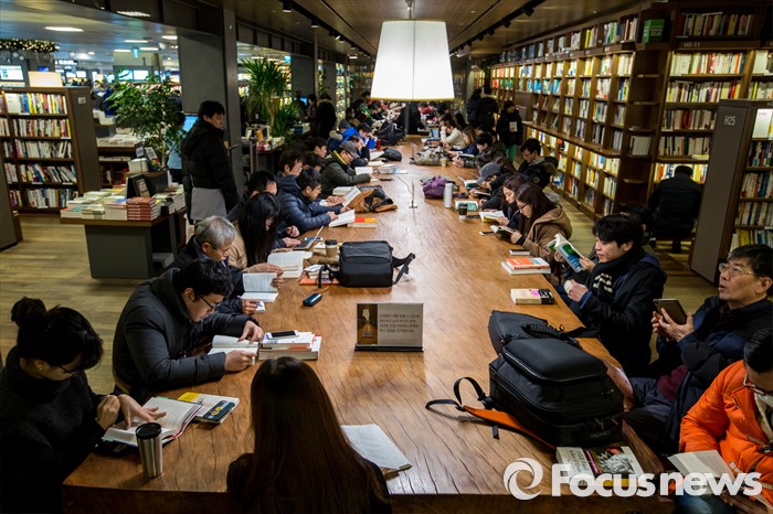 (서울=포커스뉴스) 서울 한 낮 기온이 영하권에 머물며 연일 강추위가 이어지고 있는 25일 오후 서울 종로구 교보문고 광화문점을 찾은 고객들이 추위를 피하며 독서 하고 있다.