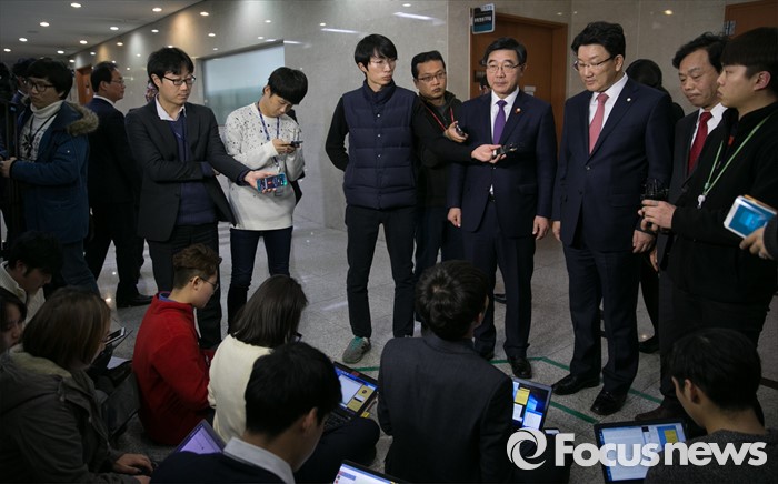(서울=포커스뉴스) 이기권 고용노동부 장관과 새누리당 노동선진화특위원장 소속 권성동, 이완영 의원이 25일 오후 서울 여의도 국회 정론관에서 노동개혁 2대 지침(일반해고 지침, 취업규칙 지침) 설명회를 마친 뒤 브리핑을 하고 있다.