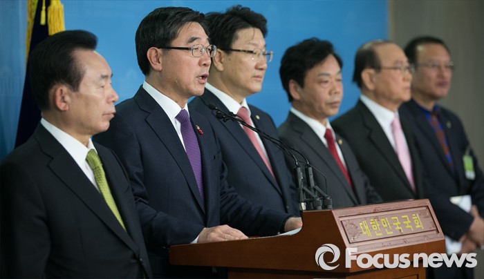 (서울=포커스뉴스) 이기권 고용노동부 장관과 이인제 새누리당 노동선진화특위원장 등 의원들이 25일 오후 서울 여의도 국회 정론관에서 노동개혁 2대 지침(일반해고 지침, 취업규칙 지침) 설명회를 마친 뒤 브리핑을 하고 있다.