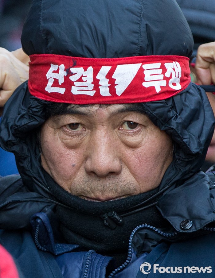 (서울=포커스뉴스) 25일 오후 서울 중구 지방고용노동청 앞에서 열린 '민주노총 수도권 총파업 결의대회'에 참가한 노조원이 머리띠를 묶고 있다.
