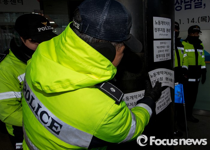(서울=포커스뉴스) 25일 오후 서울 중구 지방고용노동청 앞에서 열린 '민주노총 수도권 총파업 결의대회'에 참가한 노조원이 노동청 벽에 붙인 항의 스티커들을 경찰이 제거하고 있다.