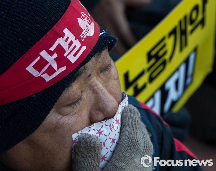 (서울=포커스뉴스) 25일 오후 서울 중구 지방고용노동청 앞에서 열린 '민주노총 수도권 총파업 결의대회'에 참가한 노조원이 핫팩으로 추위를 이기고 있다.