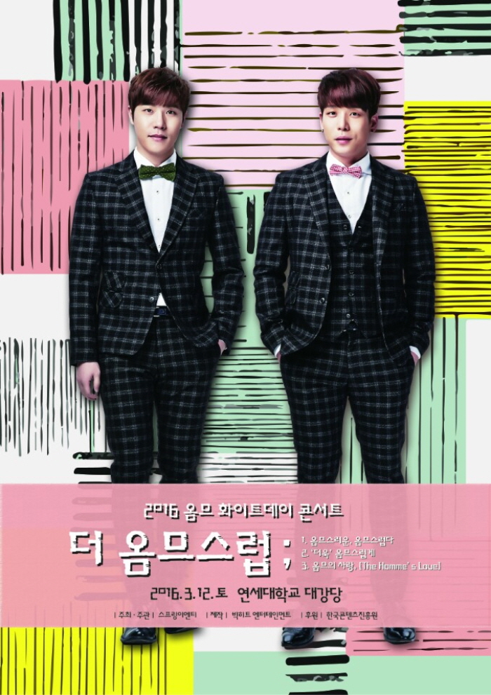 빅히트엔터테인먼트는 26일 "옴므(이현·이창민)의 화이트데이 콘서트 '더 옴므스럽(The Homme’s Love)'이 오는 3월12일 연세대학교 대강당에서 열린다”고 전했다. ’더 옴므스럽’은 연애하고 사랑하고 결혼하는 것이 점점 더 어려워지는 시대의 ‘사랑’에 대해 ‘더욱 옴므스럽게' ‘옴므만의 사랑 이야기’로 풀어보겠다는 뜻을 담고 있다.