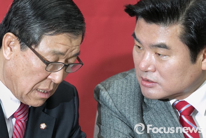 (서울=포커스뉴스) 원유철(오른쪽) 새누리당 원내대표와 황진하 사무총장이 26일 오전 서울 여의도 국회에서 열린 원내대책회의에 참석해 대화하고 있다.