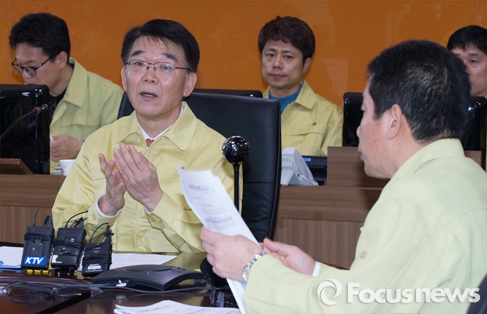 (세종=포커스뉴스) 강호인 국토교통부장관이 26일 오전 세종시 정부세종청사 국토교통부 제주공항체류여객 비상수송대책본부에 방문해 운항상황을 점검하고 있다.