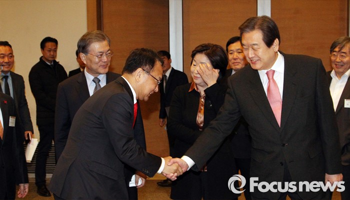 한편, 김 대표는 하루 전인 25일 이뤄진 야당의 통합과 연대에 대해 "정치 후진적인 단면을 다시 국민 앞에 노출시킨 것"이라면서 "얼마 전까지 서로 다른 입장을 취하고 공방을 벌이다가 선거의 불리함을 느끼자 다시 손 잡는다는 것은 옳지 못한 일"이라고 비판했다.중장기 어젠다 추진 전략회의가 26일 대한상공회의소 국제회의장에서 열린 가운데 회의전 김무성 새누리당 대표와 유일호 경제부총리 겸 기획재정부 장관이 악수 하고 있다. 2016.01.26 강진형 기자