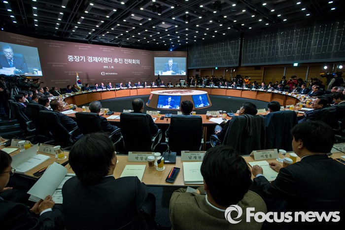 (서울=포커스뉴스) 문재인 더물어민주당 대표가 26일 오전 서울 중구 대한상공회의소 국제회의장에서 열린 '중장기 경제어젠다 추진 전략회의'에 자리해 축사하고 있다. 이날 회의에 자리한 여야정 대표 및 산학연 대표 70여명은 규제 근본 틀 개선, 기업문화 개선, 국민 행복 위한 서비스 발전 등을 논의 할 예정이다.