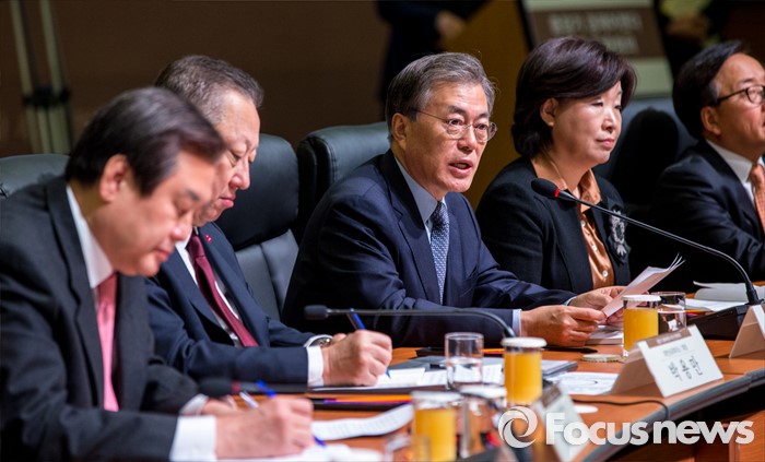 (서울=포커스뉴스) 문재인 더물어민주당 대표가 26일 오전 서울 중구 대한상공회의소 국제회의장에서 열린 '중장기 경제어젠다 추진 전략회의'에 자리해 축사하고 있다. 이날 회의에 자리한 여야정 대표 및 산학연 대표 70여명은 규제 근본 틀 개선, 기업문화 개선, 국민 행복 위한 서비스 발전 등을 논의 할 예정이다.