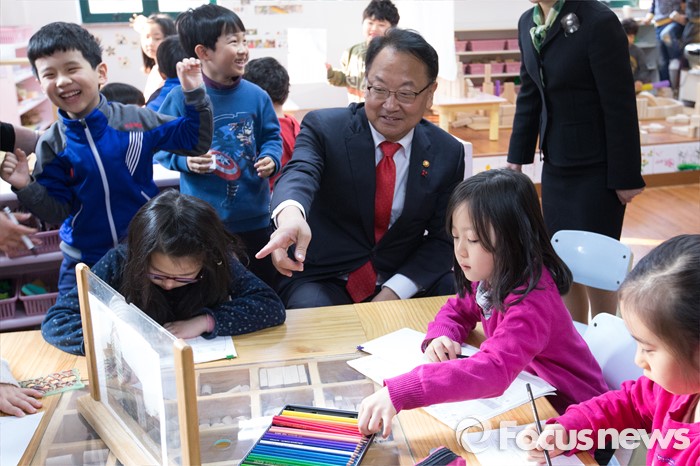 (서울=포커스뉴스) 누리과정 관련 현장을 방문한 유일호 경제부총리 겸 기획재정부 장관이 26일 오전 서울 강서구 보라유치원에 방문해 아이들이 노는 모습을 지켜보고 있다.