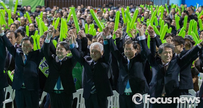 (전주=포커스뉴스) 26일 오전 전주시 완산구 전주화산체육관에서 열린 국민의당(가칭) 전라북도당 창당대회에서 안철수 의원, 천정배 의원 등 창당준비위원들이 당원들의 환호에 답하고 있다.