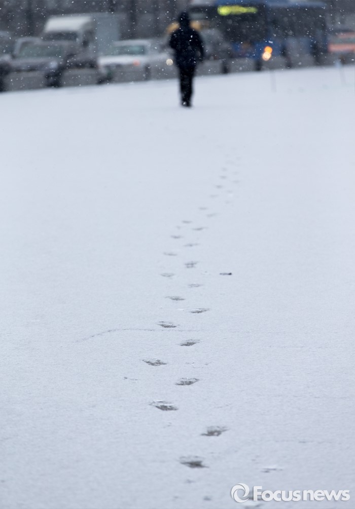 (서울=포커스뉴스) 서울을 비롯한 중부지역 곳곳에 눈이 내린 26일 오전 한 시민이 발자국을 남기며 서울 광화문광장을 걷고 있다.