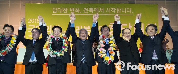 (전주=포커스뉴스) 26일 오전 전주시 완산구 전주화산체육관에서 열린 국민의당(가칭) 전라북도당 창당대회에서 안철수 의원, 천정배 의원 등 창당준비위원들이 당원들의 환호에 답하고 있다.