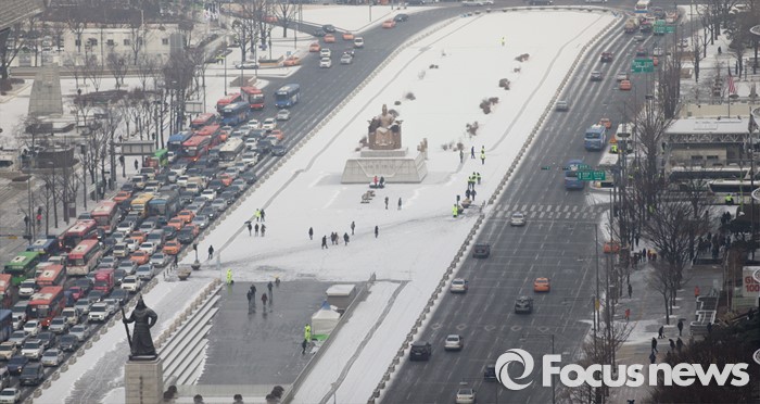 (서울=포커스뉴스) 서울을 비롯한 중부지역 곳곳에 눈이 내린 26일 오전 서울 광화문광장에 하얗게 눈이 쌓이고 있다.