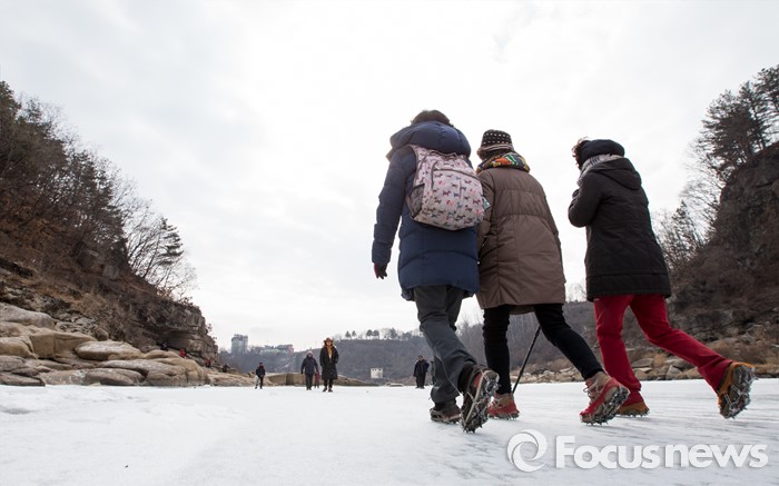 (철원=포커스뉴스) 26일 오전 강원 철원군 한탄강 일대에서 여행객들이 얼음트래킹을 즐기고 있다.