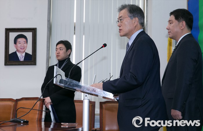 (서울=포커스뉴스) 문재인(가운데) 더불어민주당 대표가 26일 오후 서울 여의도 국회에서 열린 김병기 전 국가정보원 인사처장 인재영입 기자회견에 참석해 인사말을 하고 있다.