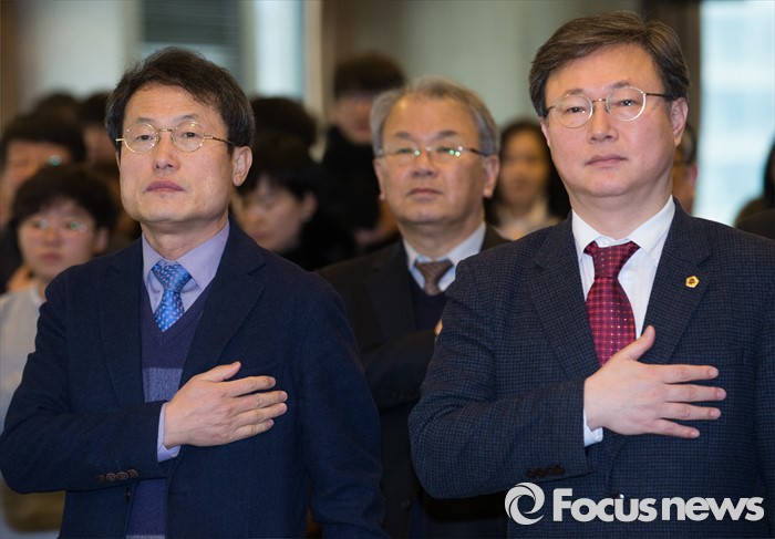 (서울=포커스뉴스) 26일 오후 서울 중구 한국프레스센터에서 열린 '1.26 서울 학생 인권의 날 선포식'에 참석한 조희연(왼쪽) 서울시 교육감 등 참석자들이 국민의례를 하고 있다.