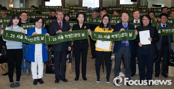(서울=포커스뉴스) 26일 오후 서울 중구 한국프레스센터에서 열린 '1.26 서울 학생 인권의 날 선포식'에 참석한 조희연(왼쪽 네번째) 서울시 교육감 등 참석자들이 학생 인권의 날 선포를 축하하고 있다.