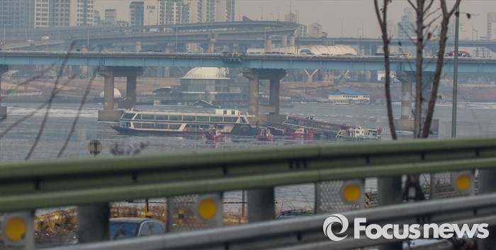 (서울=포커스뉴스) 26일 오후 2시 31분쯤 서울 광진구 영동대교 인근 한강에서 이랜드 크루즈 유람선에 침수사고가 발생했다.