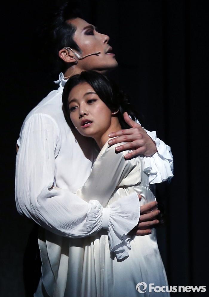 (서울=포커스뉴스) 26일 오후 서울 종로구 세종문화회관에서 열린 뮤지컬 '드라큘라' 프레스콜에 참석한 배우 박은석(왼쪽)과 임혜영이 하이라이트 공연을 선보이고 있다.