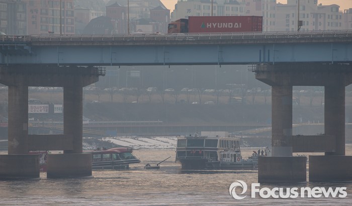 (서울=포커스뉴스) 26일 오후 서울 한강 영동대교 인근을 지나던 한강유람선이 침수, 구조대원들이 구조활동과 견인 작업을 하고 있다.