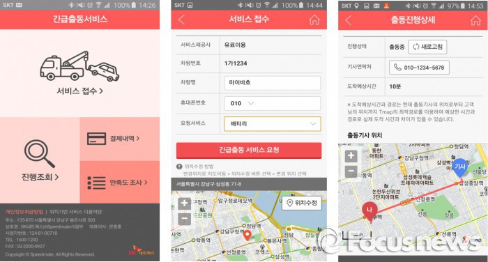 이 서비스는 현재 AXA손해보험, 롯데손해보험, 흥국화재보험 긴급출동 가입 고객이 이용할 수 있다. 업체 측은 향후 제휴 보험사들을 지속적으로 확대할 계획이다.사진은 모바일 긴급출동서비스 구현 화면 <사진제공=SK네트웍스> 2016.1.26. 김현이 인턴기자