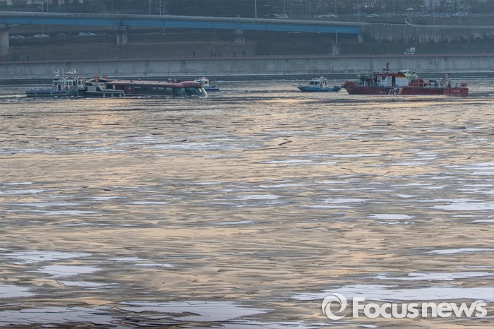 (서울=포커스뉴스) 26일 오후 서울 한강 영동대교 인근을 지나던 한강유람선이 침수, 구조대원들이 구조활동과 견인 작업을 하고 있다.