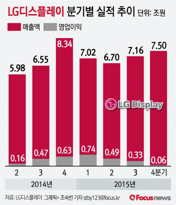 (서울=포커스뉴스) 26일 LG디스플레이는 지난해 4분기 영업이익은 606억원이라고 공시했다. 이는 2014년 4분기(6268억원)에 비해 90.3% 하락한 실적이다.