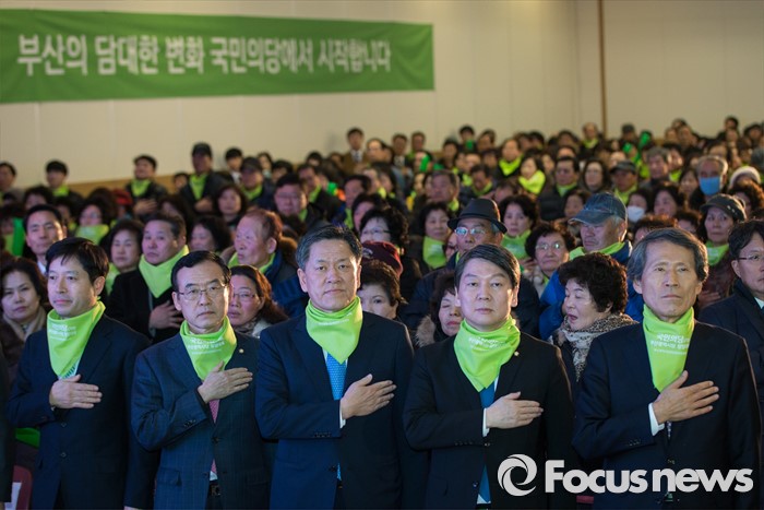 | △ 국민의당 '부산시당 창당대회', 국기에 대한 경례하는 안철수와 한상진 |