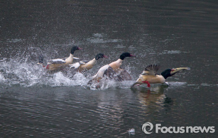 (하남=포커스뉴스) 한파가 누그러진 27일 오전 얼었던 한강이 다소 풀리자 경기도 하남시 팔당대교 아래 강변에서 겨울철새 비오리가 누치사냥을 하고 있다.