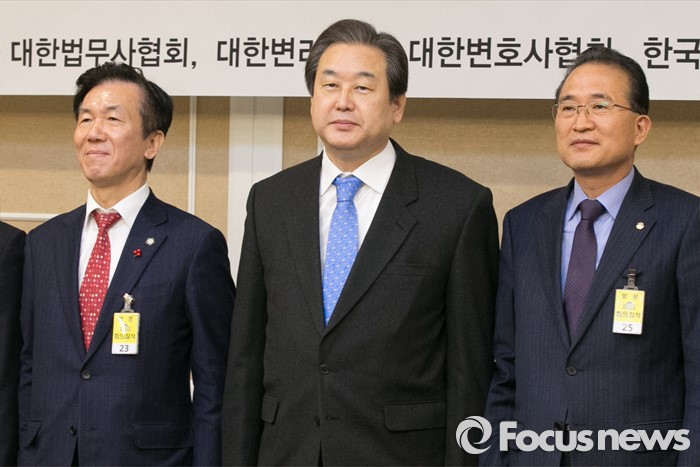 (서울=포커스뉴스) 김무성(가운데) 새누리당 대표가 27일 오전 서울 여의도 국회 귀빈식당에서 비공개로 진행된 법조전문자격사포럼 조찬 간담회에 참석해, 본격적인 포럼 전 하창우(왼쪽) 대한변호사협회 회장을 비롯한 각 단체 대표들과 기념사진을 찍고있다.