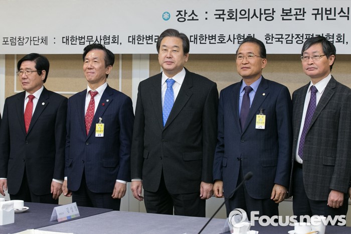 (서울=포커스뉴스) 김무성(가운데) 새누리당 대표가 27일 오전 서울 여의도 국회 귀빈식당에서 비공개로 진행된 법조전문자격사포럼 조찬 간담회에 참석해, 본격적인 포럼 전 하창우(왼쪽 두번째) 대한변호사협회 회장을 비롯한 각 단체 대표들과 기념사진을 찍고있다.