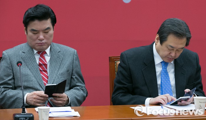 (서울=포커스뉴스) 김무성(오른쪽) 새누리당 대표와 원유철 원내대표가 27일 오전 서울 여의도 국회에서 열린 최고중진연석회의에 참석해, 각각 스마트폰을 보고 있다.