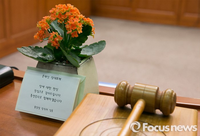 (서울=포커스뉴스) 27일 오전 서울 여의도 국회에서 문재인 더불어민주당 대표 등 지도부의 마지막 최고위원회의에 앞서 당직자들이 선물한 꽃이 자리에 놓여 있다.