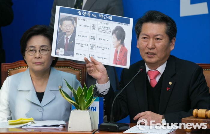 (서울=포커스뉴스) 정청래 더불어민주당 최고위원이 27일 오전 서울 여의도 국회에서 열린 최고위원회의에 참석해 과거 회의 중 공개했던 자료에서 가장 기억에 남는다는 자신과 박근혜 대통령의 의정활동 비교자료를 들고 발언하고 있다.