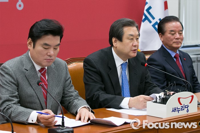 (서울=포커스뉴스) 김무성(가운데) 새누리당 대표가 27일 오전 서울 여의도 국회에서 열린 최고중진연석회의에 참석해 모두발언하고 있다.