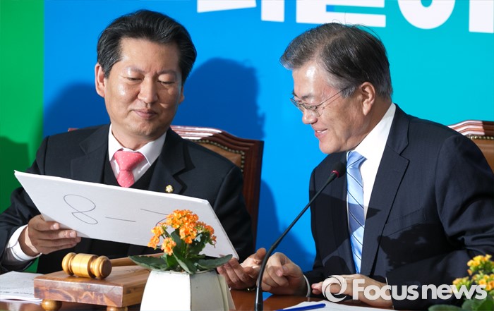 (서울=포커스뉴스) 문재인(오른쪽) 더불어민주당 대표가 27일 오전 서울 여의도 국회에서 열린 최고위원회의에 참석해 정청래 최고위원의 자료를 보며 대화하고 있다.