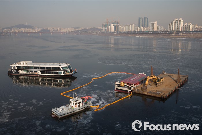 (서울=포커스뉴스) 27일 오전 서울 한강 영동대교 아래에서 침수된 한강유람선을 인양하기 위해 바지선이 정박해 있다.